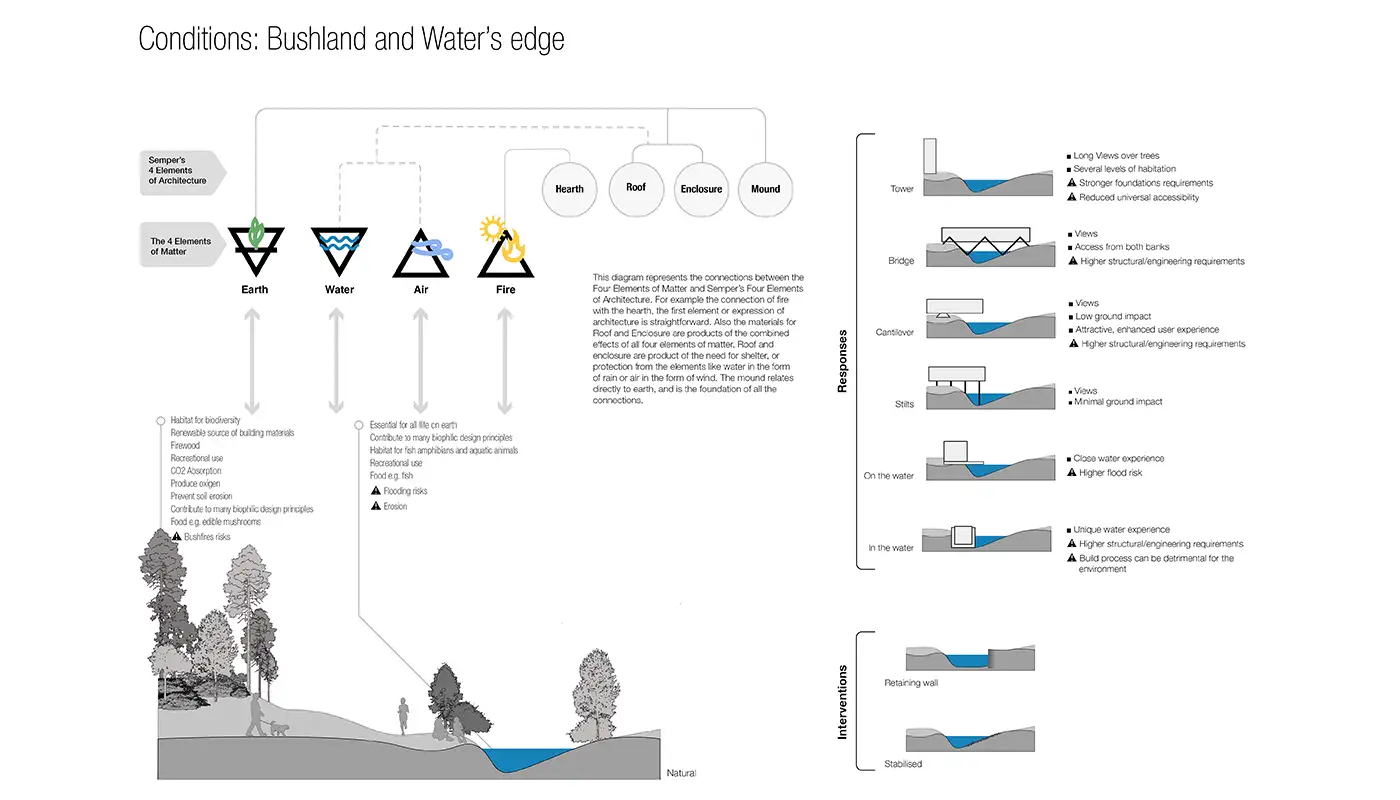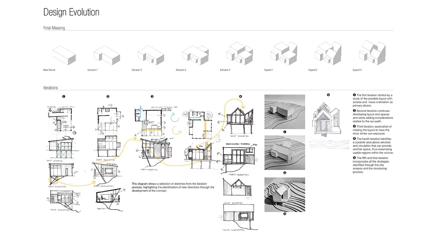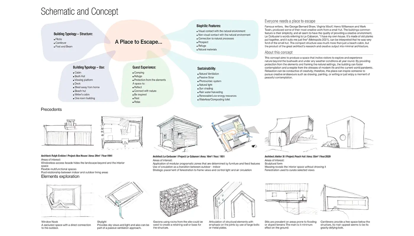 The project involved designing a habitable space by following a prescribed process. The process included several tasks, such as identifying and researching various conditions (e.g. water's edge, bushland, desert), selecting a site based on the findings, analyzing the site, and developing a design concept based on the choices made so far. The project provided a learning experience in understanding the architectural design process, its language and discourse. The proposed design program, named "A Place to Escape," fulfilled the requirements and was eco-friendly. The materials were chosen based on their purpose and function, such as Corrugated Steel for its durability and fire resistance qualities and wood for the interior for its sustainability and aesthetic appeal.